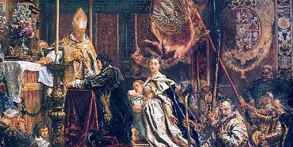 Tuż przed wojną ze Szwedami doszło do sporu króla ze szlachtą, co spowodowało, że kiedy monarcha stanął na czele pospolitego ruszenia, szybko okazało się, że nie może być pewien swych poddanych. Po niepowodzeniach wojskowych i zdradach musiał uciekać z garstką wiernych na Śląsk. Sukcesy Szwedów wprawiły go w depresję, ale na wieść o narastającym w Polsce ruchu oporu odzyskał wigor i wezwał do powstania przeciw najeźdźcy. Kiedy dowiedział się, że wojsko zamierza odstąpić Szwedów, ruszył do Polski i przez Słowację i Podkarpacie dotarł do Lwowa. Pragnąc rozniecić ducha bojowego wśród chłopów, ślubował 1 IV 1656 roku w katedrze Wniebowzięcia Najświętszej Maryi Panny we Lwowie, że ulży doli niższych stanów. Śluby te powtórzył latem pod Warszawą. Król oddał Rzeczpospolitą pod opiekę Matki Bożej, którą nazwał Królową Korony Polskiej. Obiecał, że poprawi los chłopów i mieszczan, kiedy tylko kraj zostanie wyzwolony spod okupacji. Obietnice te nie zostały zrealizowane, ale przeszły do narodowej tradycji. Ślubom lwowskim poświęcił swój ostatni wielki obraz Jan Matejko. Na jego płótnie król klęczy przed ołtarzem, a za nim królowa Maria Ludwika i hetman Stefan Czarniecki. Przy królu stoi biskup lwowski Jan Tarnowski. Widoczni są także między innymi marszałek wielki koronny Jerzy Sebastian Lubomirski (obok Czarnieckiego), hetman polny koronny Stanisław Lanckoroński (z buławą w ręce), hetman wielki koronny Stanisław Rewera Potocki (klęczy), książę Krzysztof Zbaraski (trzyma chorągiew). Matejko pracował nad tym obrazem wiele miesięcy, ale nie zdołał go już dokończyć przed śmiercią. Więcej informacji, ciekawostek i materiałów dotyczących życia króla Jana II Kazimierza Wazy znajdziesz w jego biogramie i na innych stronach naszego serwisu.