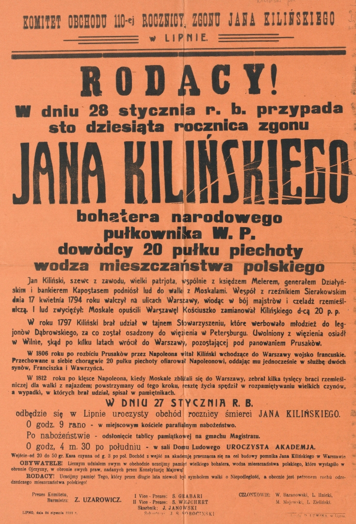 , Afisz Komitetu obchodu 110-ej rocznicy zgonu Jana Kilińskiego w Lipnie., [w:] Polski słownik biograficzny, t. ,