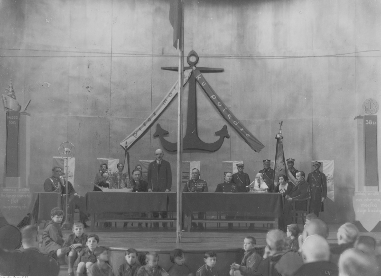 Uroczysta akademia z okazji rocznicy odzyskania dostępu do morza. Widoczni m.in.: od lewej prezes okręgu Funduszu Obrony Morskiej płk Tadeusz Tomaszewski, prof. dr Podkówka, dyrektor Kessler, prezes Dyrekcji Okręgu Kolei Państwowych inż. Mieczysław Stodolski, delegat Zarządu Głównego wiceprezes Dębski, gen. bryg. Bernard Mond, komandor Władysław Kosianowski, dyrektor poczty krakowskiej Julian Gostwicki, inżynierowa Czaplicka, kpt. Suchoń.