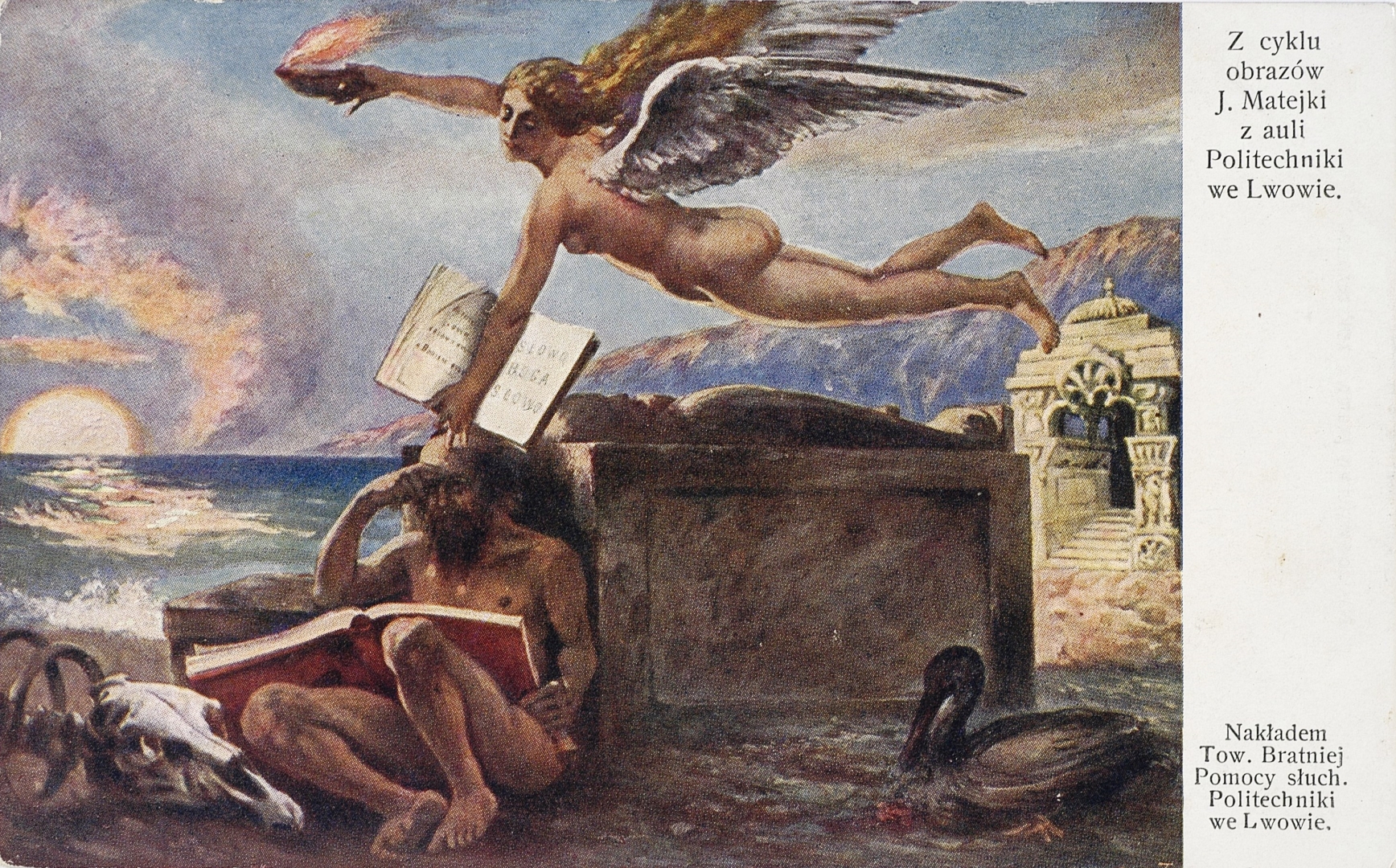 Pocztówka z około 1910 roku z obrazem z cyklu ukazującego postęp cywilizacji zdobiącego aulę Politechniki we Lwowie. Cykl ten, złożony z 11 obrazów, powstał według programu ideowego i szkiców Jana Matejki wykonanych w latach 1883-1885. Namalowali go jego uczniowie i wykładowcy Krakowskiej Szkoły Sztuk Pięknych. Obrazy zamontowano w auli w 1892 roku.