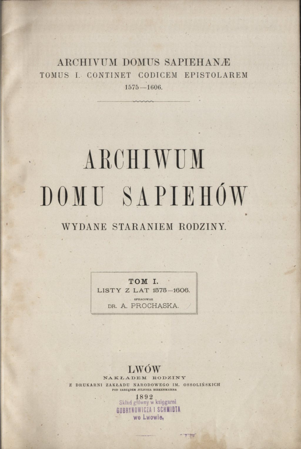 Antoni Prochaska "Archiwum domu Sapiehów wydane staraniem rodziny" (strona tytułowa), [online] Warszawa: Narodowy Instytut Audiowizualny [dostęp 13.04.2026]. Dostępny w internecie: http://www.ipsb.nina.gov.pl/a/foto/antoni-prochaska-archiwum-domu-sapiehow-wydane-staraniem-rodziny-strona-tytulowa