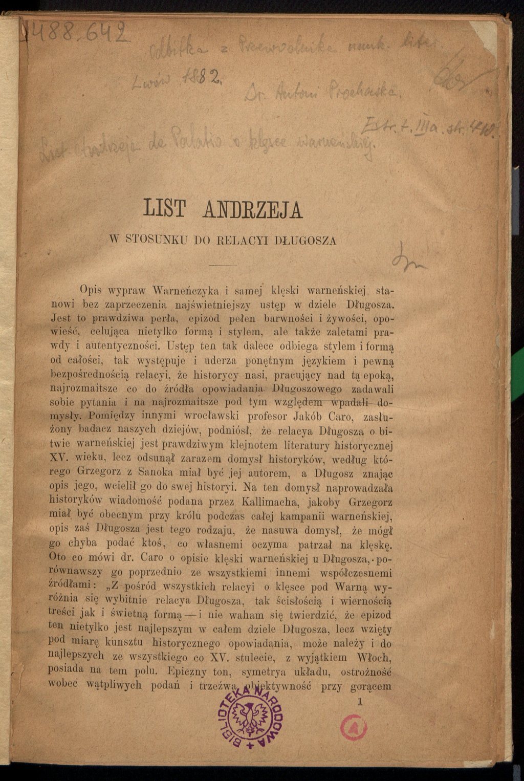 , Antoni Prochaska "List Andrzeja de Palatio o klęsce warneńskiej" (fragment), [w:] Polski słownik biograficzny, t. ,