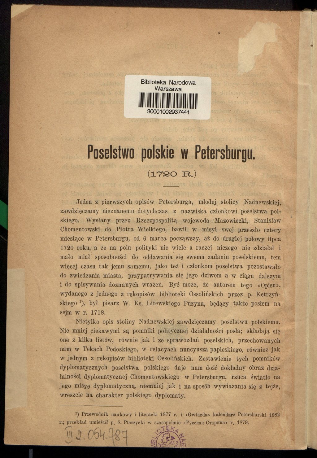 , Antoni Prochaska "Poselstwo polskie w Petersburgu" (fragment), [w:] Polski słownik biograficzny, t. ,
