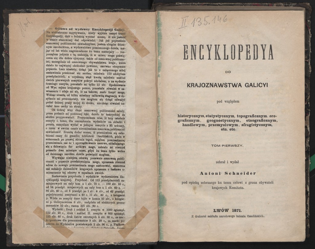 Antoni Schneider "Encyklopedya do krajoznawstwa Galicyi pod względem historycznym, statystyczym, topograficznym" (strona tytułowa), [online] Warszawa: Narodowy Instytut Audiowizualny [dostęp 01.04.2026]. Dostępny w internecie: http://www.ipsb.nina.gov.pl/a/foto/antoni-schneider-encyklopedya-do-krajoznawstwa-galicyi-pod-wzgledem-historycznym-statystyczym-topograficznym-strona-tytulowa