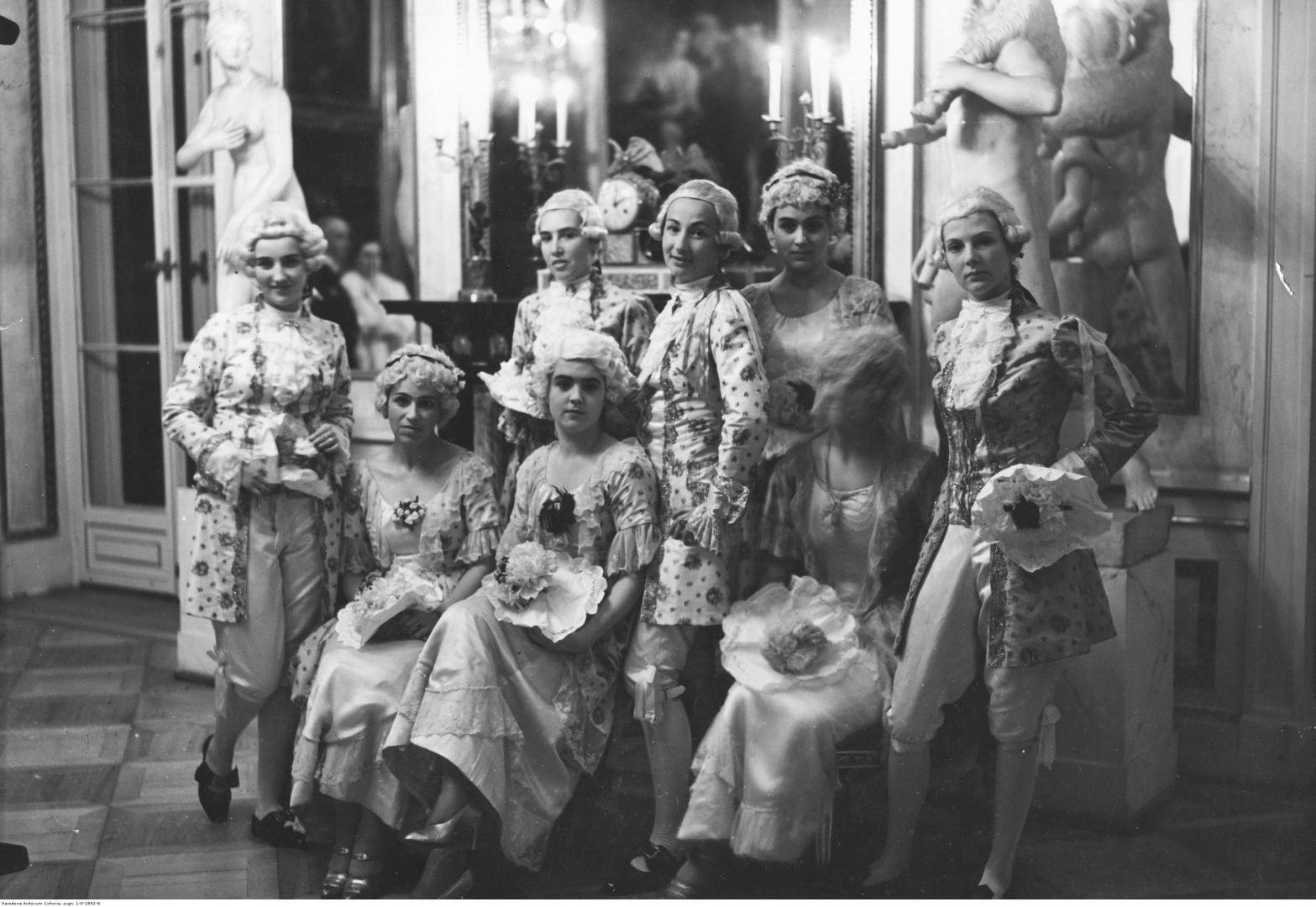 Grupa pań ubranych w stylowe stroje, która odtańczyła menueta podczas balu. Od lewej siedzą panie: Smolarska, Irena Eichnerówna oraz córka posła nadzwyczajnego i ministra pełnomocnego Portugalii w Polsce panna de Sousa Mendes. Od lewej stoją panie: Wendowa, Maria Podhorska, Zofia Soboltwa, Górska i Wanda Bork.
