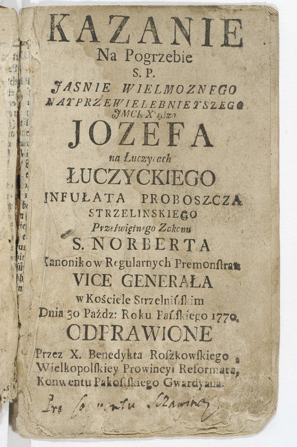 Benedykt Roszkowski "Kazanie na pogrzebie [...] Jozefa na Łuczycach Łuczyckiego, infułata proboszcza strzelinskiego przeświętego zakonu s. Norberta kanonikow regularnych premonstra, vice generała w kościele strzelnińskim dnia 30 paźdz. roku Pańskiego 1770 odprawione" (strona tytułowa)