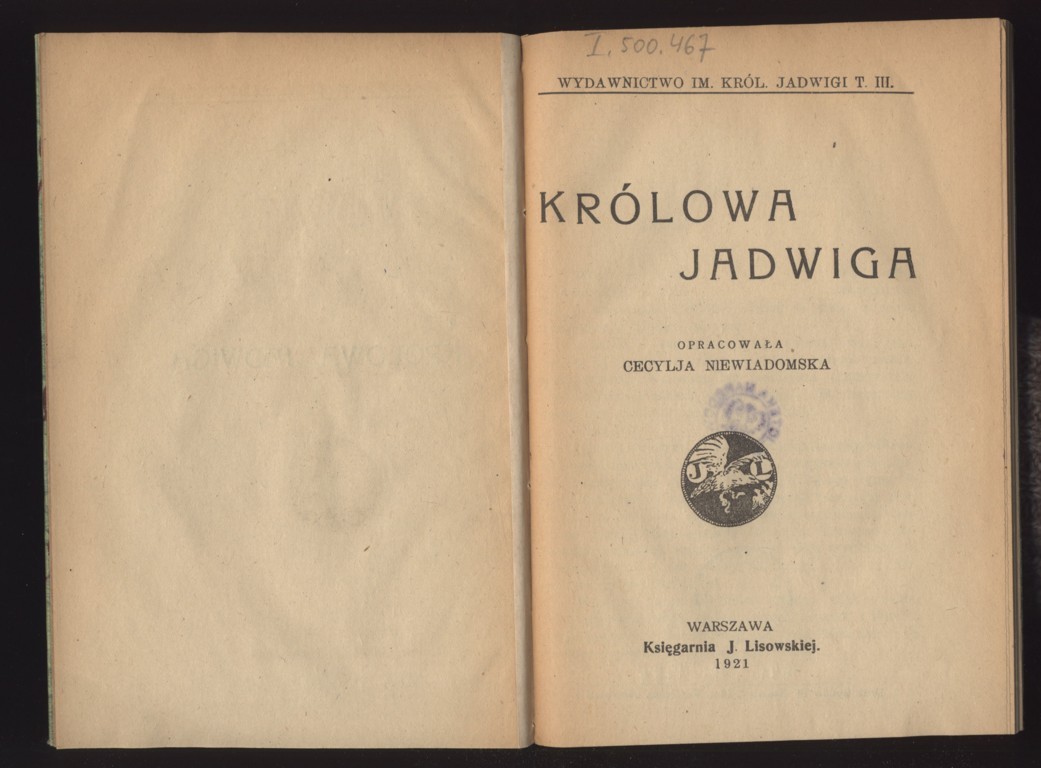 Cecylia Niewiadomska "Królowa Jadwiga" (strona tytułowa), [online] Warszawa: Narodowy Instytut Audiowizualny [dostęp 13.04.2026]. Dostępny w internecie: http://www.ipsb.nina.gov.pl/a/foto/cecylia-niewiadomska-krolowa-jadwiga-strona-tytulowa