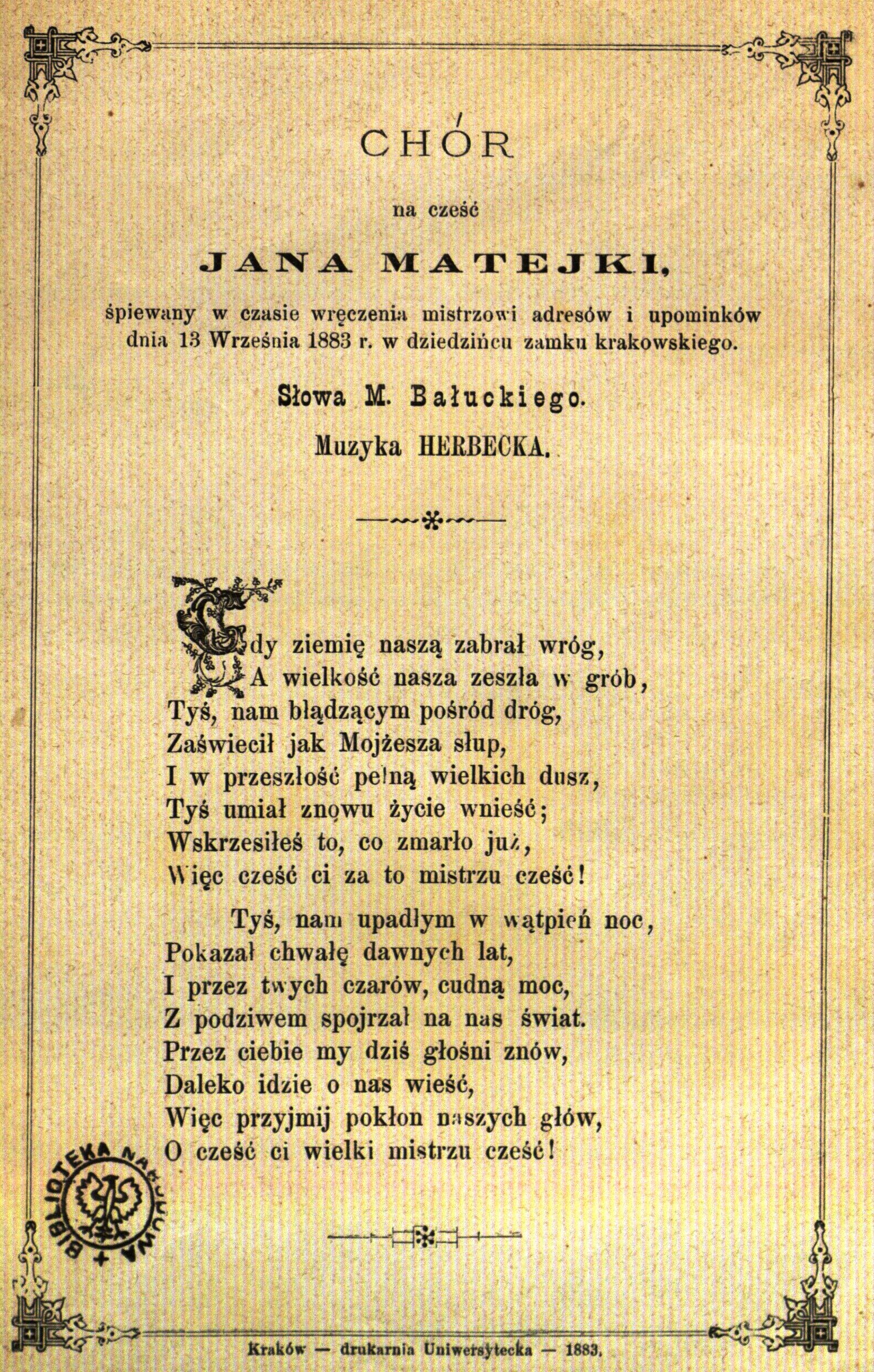 , "Chór na cześć Jana Matejki, śpiewany w czasie wręczenia mistrzowi adresów i upominków 13 września 1883 r. w dziedzińcu zamku krakowskiego" Michała Bałuckiego., [w:] Polski słownik biograficzny, t. ,