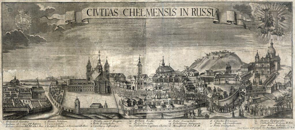 Miedzioryt stworzony po 1780 roku. Pokazana została Koronacya Cudownego obrazu Nayświętszey Panny Maryi w Chełmskiey katedrze, obrządku greckiego [...] odprawiona w roku 1765 [...], w Berdyczowie w Drukarni Fortecy N. M. Panny 1780. Rastawiecki 1886 s. 255, poz. 29.