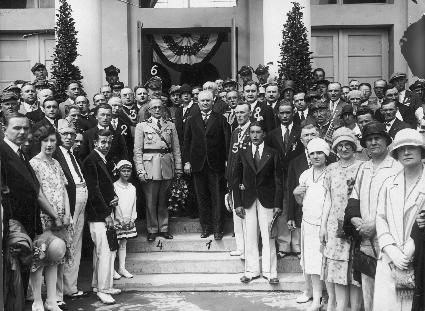 Członkowie Towarzystwa i władz miasta w dniu więta Stanów Zjednoczonych w pawilonie Polonii na Powszechnej Wystawie Krajowej. Widoczni m.in.: prezydent Poznania Cyryl Ratajski (1), starosta krajowy poznański Ludwik Begale (2), ks. infułat Józef Kłos (3), prezes Towarzystwa Gimnastycznego "Sokół" w Stanach Zjednoczonych dr Starzyński (4), przewodniczący angielskiej delegacji na zlot sokołów w Poznaniu p. Weest (5), prof. Bronisław Dembiński, dyr. MUP Mizgalski (7), red. Florian Piskorski (8).