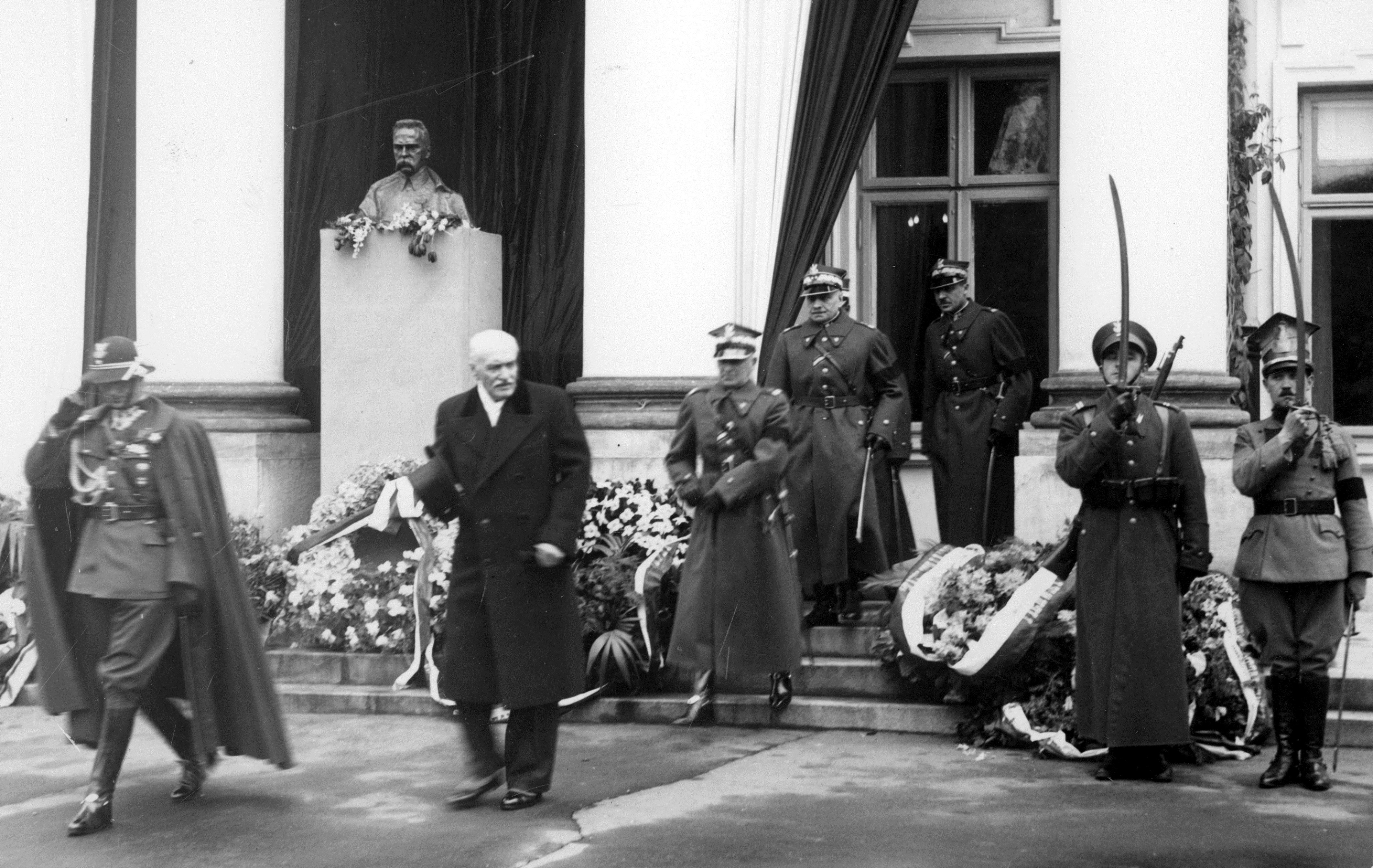 Czwarta rocznica śmierci marszałka Polski Józefa Piłsudskiego w Warszawie 12-14.05.1939 r. share Podziel się facebook google + twitter linkedin clipboard envelope print quote picture add × Cytowane źródła Cytowanie źródła on-line, czyli Internetowego Polskiego Słownika Biograficznego Czwarta rocznica śmierci marszałka Polski Józefa Piłsudskiego w Warszawie 12-14.05.1939 r., [online] Warszawa: Narodowy Instytut Audiowizualny [dostęp 13.04.2026]. Dostępny w internecie: http://www.ipsb.nina.gov.pl/a/foto/czwarta-rocznica-smierci-marszalka-polski-jozefa-pilsudskiego-w-warszawie-12-14051939-r Cytowanie wydania drukowanego, czyli Polskiego Słownika Biograficznego , Czwarta rocznica śmierci marszałka Polski Józefa Piłsudskiego w Warszawie 12-14.05.1939 r., [w:] Polski słownik biograficzny, t. , IPSBID: ipsb-fo-78713 × Wyślij link do strony E-mail odbiorcy wiadomości: To pole jest wymaganeWpisz poprawny adres e-mail Twój adres e-mail: To pole jest wymaganeWpisz poprawny adres e-mail Podgląd wiadomości, która zostanie wysłana: Witaj, [Tutaj podany Twój e-mail] poleca Ci treść z iPSB (internetowym Polskim Słowniku Biograficznym) Czwarta rocznica śmierci marszałka Polski Józefa Piłsudskiego w Warszawie 12-14.05.1939 r. × Dodaj do kolekcji wybierz kolekcję, do której chcesz dodać ten artykuł: lub wpisz nazwę nowej kolekcji, do której chcesz dodać ten artykuł: : To pole jest wymagane Dodaj do kolekcji Wybierz kolekcję Swoje kolekcje znajdziesz w profilu. Wystarczy kliknąć ikonę zębatego koła w górnym prawym rogu. Możesz je zobaczyć tu: moje kolekcje. × Dodaj do kolekcji Element został dodany do Twojej kolekcji. Swoje kolekcje możesz zobaczyć tu: moje kolekcje. × Dodaj do kolekcji Aby dodawać materiały do kolekcji musisz się zalogować. OPIS POSTACI POWIąZANE Dostojnicy opuszczaja kaplicę belwederską po nabożeństwie. Widoczni od lewej: kpt. Józef Hartman, prezydent RP Ignacy Mościcki, marszałek Polski Edward Śmigły-Rydz, premier Felicjan Sławoj Składkowski, generał Kazimierz Schally. Postaci powiązane Edward Rydz-Śmigły 1886-03-11 - 1941-12-02 działacz niepodległościowy Kazimierz Piotr Schally 1895-02-22 - 1967-01-12 generał brygady WP więcej >> Zobacz zdjęcie w najwyższej jakości Źródło