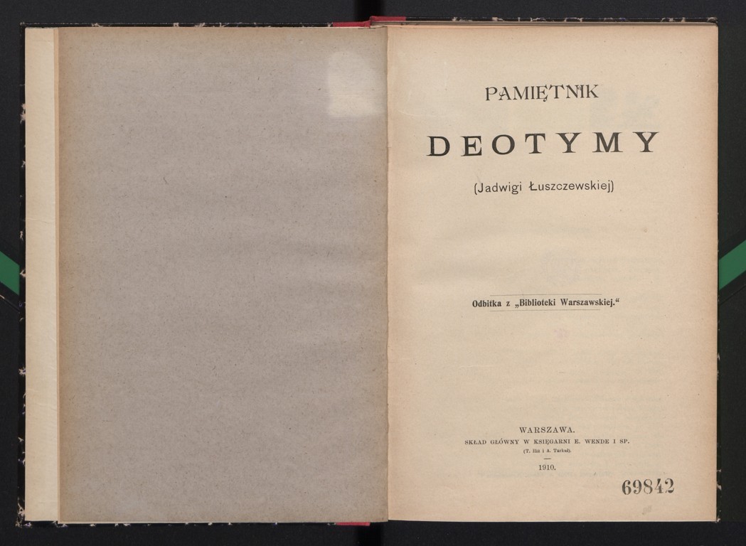 Deotyma [Jadwiga Łuszczewska] "Pamiętnik Deotymy (Jadwigi Łuszczewskiej)" (strona tytułowa), [online] Warszawa: Narodowy Instytut Audiowizualny [dostęp 05.03.2026]. Dostępny w internecie: http://www.ipsb.nina.gov.pl/a/foto/deotyma-jadwiga-luszczewska-pamietnik-deotymy-jadwigi-luszczewskiej-strona-tytulowa