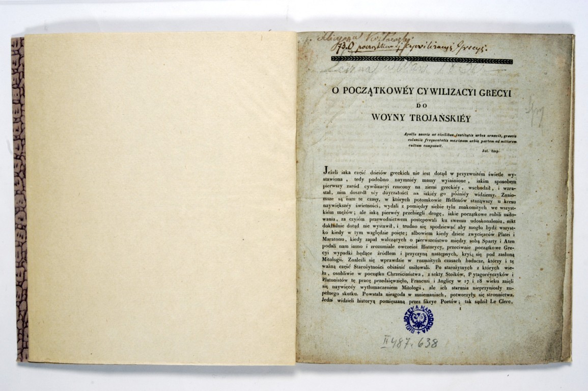 Felicjan Antoni Kozłowski, "O początkowéy cywilizacyi Grecyi do woyny trojańskiéy" (strona tytułowa), [online] Warszawa: Narodowy Instytut Audiowizualny [dostęp 13.04.2026]. Dostępny w internecie: http://www.ipsb.nina.gov.pl/a/foto/felicjan-antoni-kozlowski-o-poczatkowy-cywilizacyi-grecyi-do-woyny-trojanskiy-strona-tytulowa