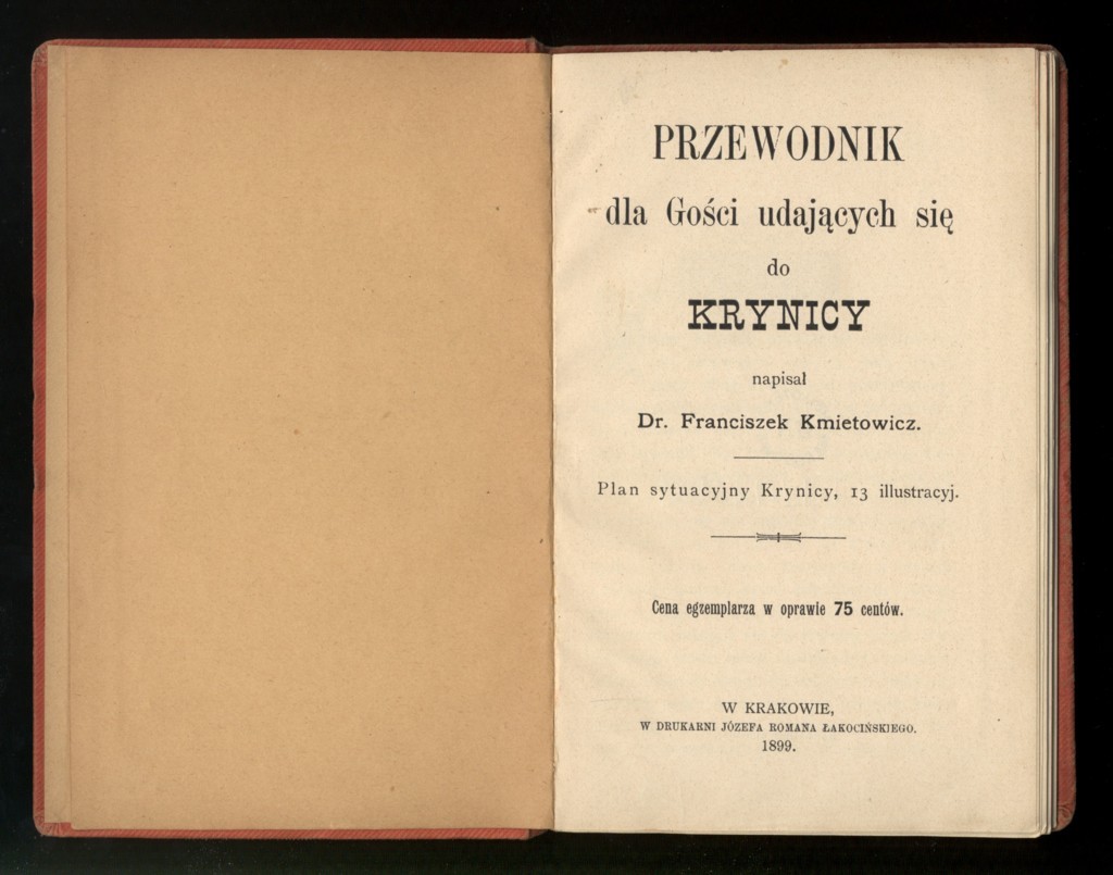 Franciszek Kmietowicz, "Przewodnik dla gości udających się do Krynicy" (strona tytułowa), [online] Warszawa: Narodowy Instytut Audiowizualny [dostęp 13.04.2026]. Dostępny w internecie: http://www.ipsb.nina.gov.pl/a/foto/franciszek-kmietowicz-przewodnik-dla-gosci-udajacych-sie-do-krynicy-strona-tytulowa