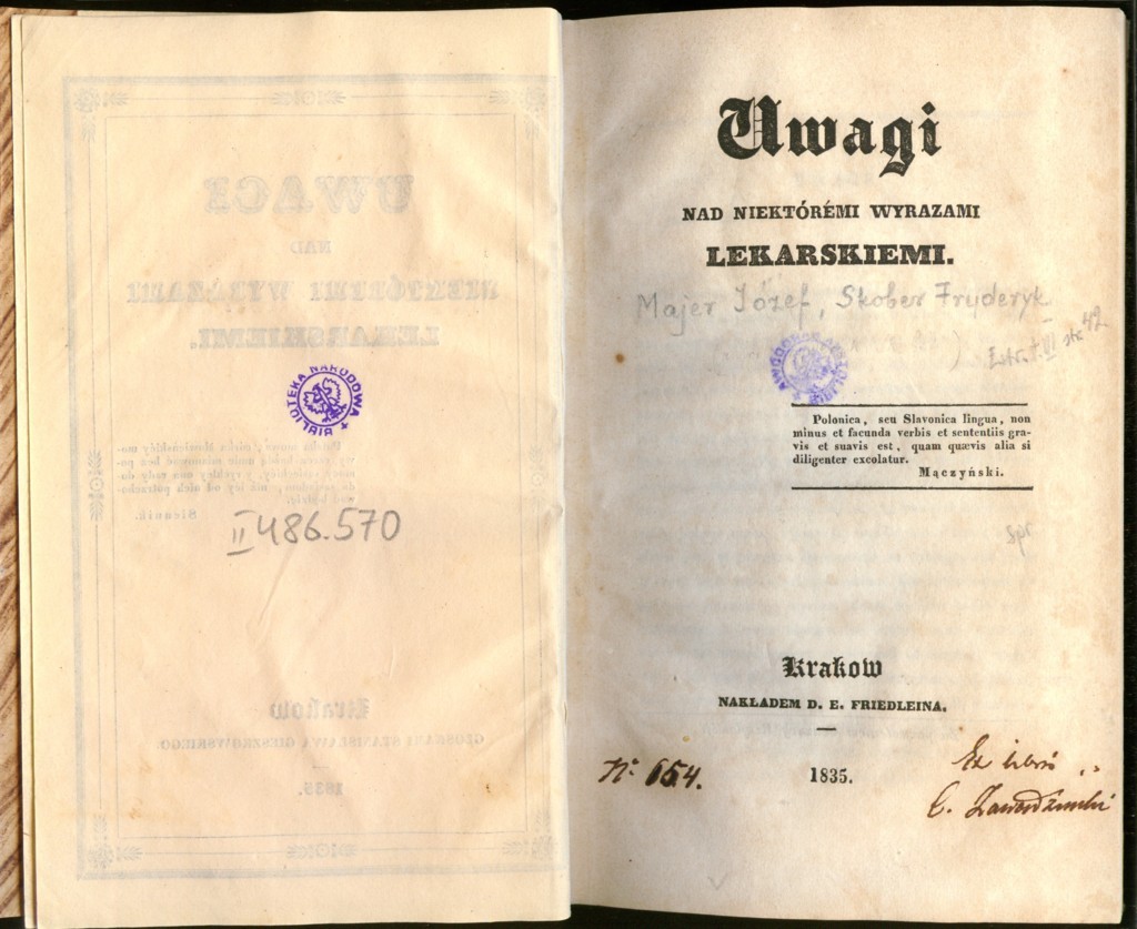 Fryderyk Kazimierz Skobel, Józef Majer "Uwagi nad niektórémi wyrazami lekarskiemi" (strona tytułowa), [online] Warszawa: Narodowy Instytut Audiowizualny [dostęp 05.03.2026]. Dostępny w internecie: http://www.ipsb.nina.gov.pl/a/foto/fryderyk-kazimierz-skobel-jozef-majer-uwagi-nad-niektormi-wyrazami-lekarskiemi-strona-tytulowa