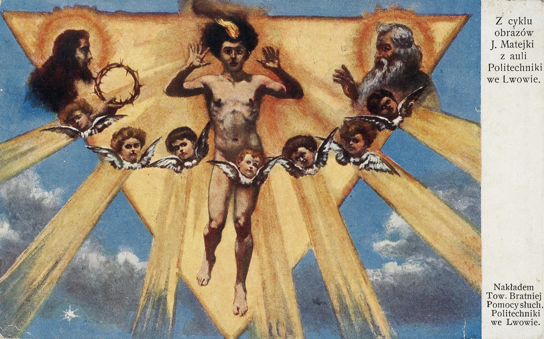 Pocztówka z około 1910 roku z obrazem z cyklu ukazującego postęp cywilizacji zdobiącego ściany auli Politechniki we Lwowie. Cykl ten, złożony z 11 obrazów, powstał według programu ideowego i szkiców Jana Matejki wykonanych w latach 1883-1885. Namalowali go jego uczniowie i wykładowcy Krakowskiej Szkoły Sztuk Pięknych, a zamontowano go w auli w 1892 roku.
