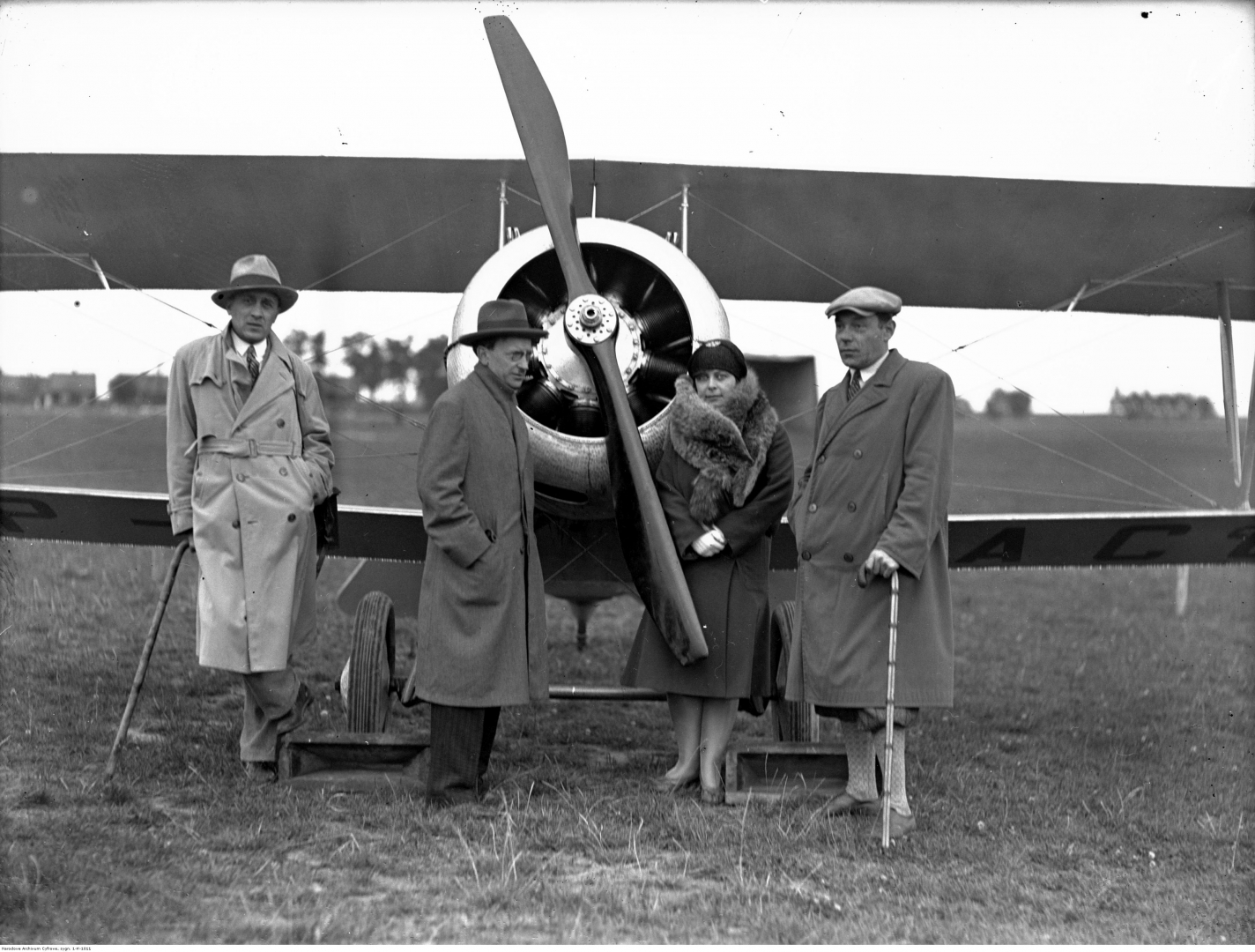 Przy samolocie Nieuport stoją, od lewej: Leon Tomaszkiewicz, Jan Stankiewicz, Jadwiga Zbrożek i Jan Śmiechowski.