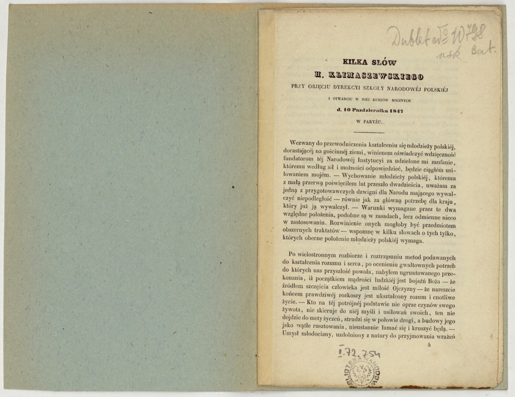 Hipolit Klimaszewski, "Kilka słów H. Klimaszewskiego przy objęciu dyrekcyi Szkoły Narodowéj Polskiéj i otwarciu w niej kursów rocznych d. 10 października 1847 w Paryżu." (strona tytułowa), [online] Warszawa: Narodowy Instytut Audiowizualny [dostęp 13.04.2026]. Dostępny w internecie: http://www.ipsb.nina.gov.pl/a/foto/hipolit-klimaszewski-kilka-slow-h-klimaszewskiego-przy-objeciu-dyrekcyi-szkoly-narodowj-polskij-i-otwarciu-w-niej-kursow-rocznych-d-10-pazdziernika-1847-w-paryzu-strona-tytulowa