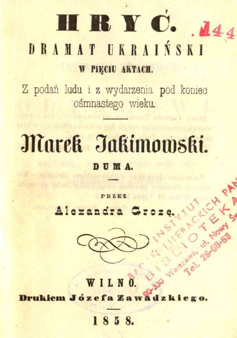 "Hryć : dramat ukraiński w pięciu aktach : z podań ludu i z wydarzenia pod koniec ośmnastego wieku; Marek Jakimowski : duma" Aleksandra Grozy., [online] Warszawa: Narodowy Instytut Audiowizualny [dostęp 13.04.2026]. Dostępny w internecie: http://www.ipsb.nina.gov.pl/a/foto/hryc-dramat-ukrainski-w-pieciu-aktach-z-podan-ludu-i-z-wydarzenia-pod-koniec-osmnastego-wieku-marek-jakimowski-duma-aleksandra-grozy