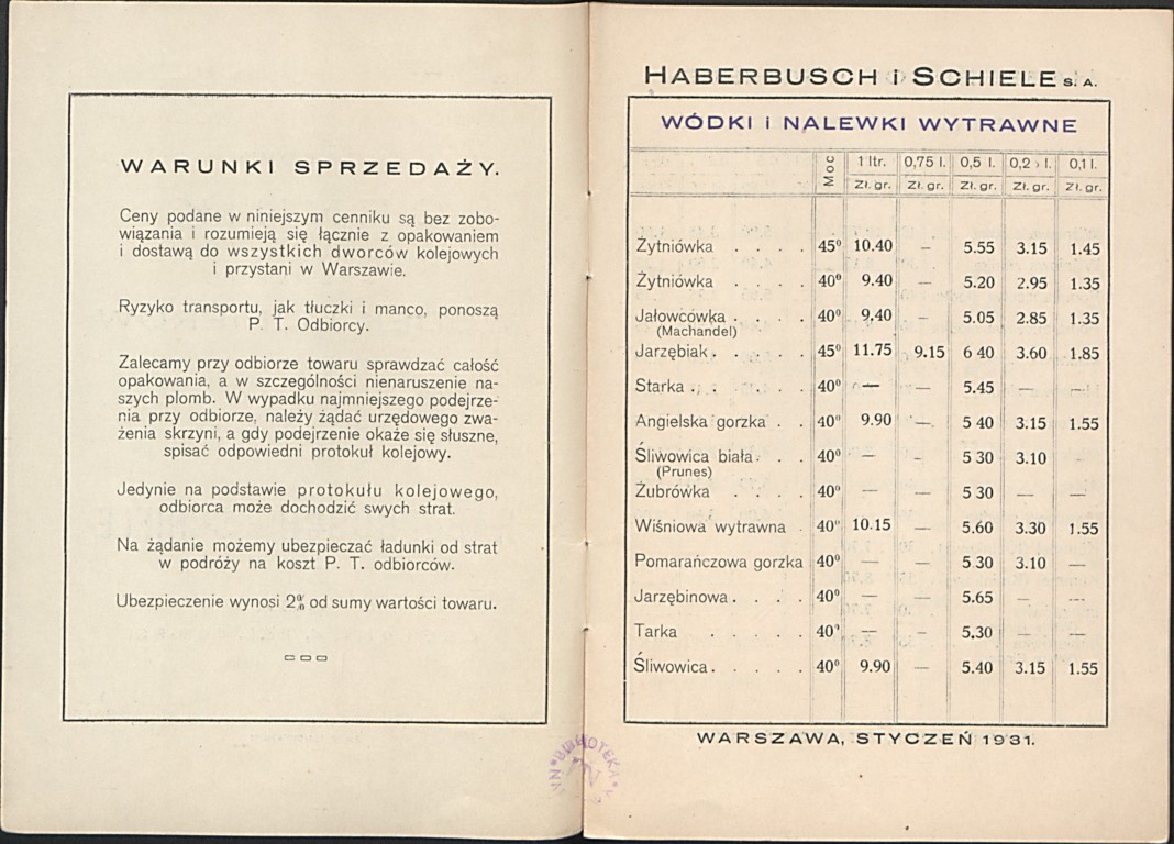 Hurtowy cennik Fabryki Wódek i Likierów Habrbusch i Schiele S.A. (1931 r.) (fragment), [online] Warszawa: Narodowy Instytut Audiowizualny [dostęp 02.04.2026]. Dostępny w internecie: http://www.ipsb.nina.gov.pl/a/foto/hurtowy-cennik-fabryki-wodek-i-likierow-habrbusch-i-schiele-sa-1931-r-fragment