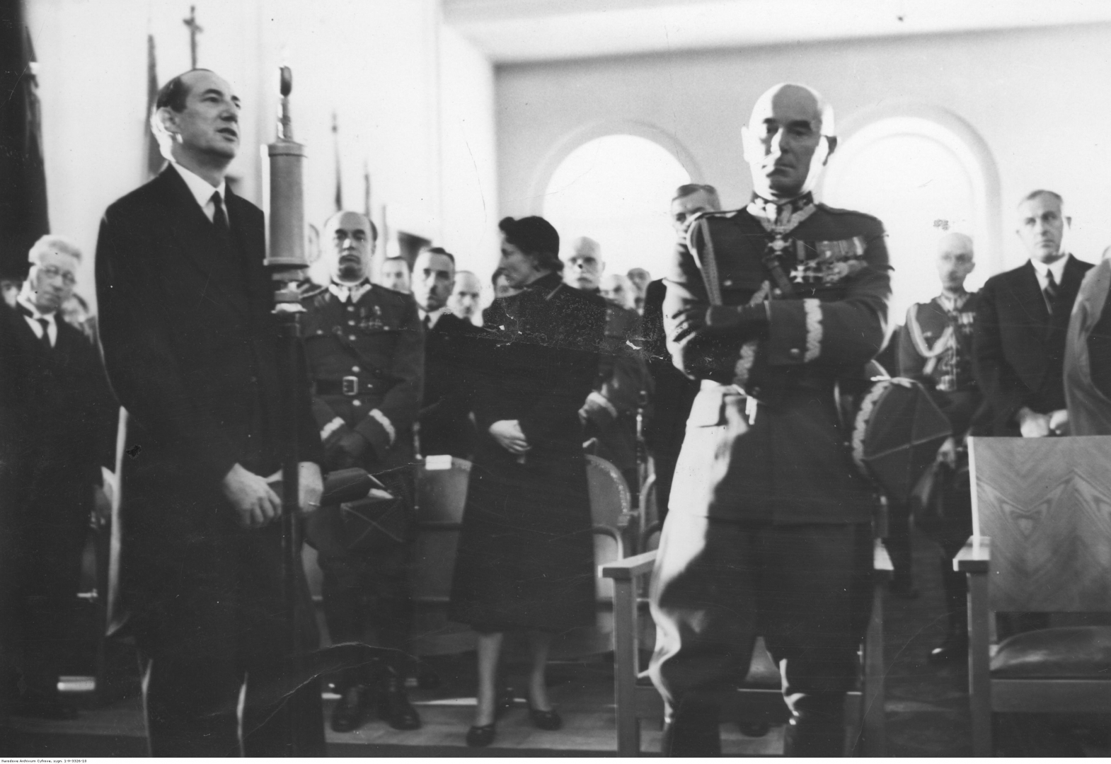 Minister spraw zagranicznych Józef Beck podczas wygłaszania przemówienia. Z prawej stoi marszałek Edward Rydz-Śmigły. W głębi widoczni m.in. minister wyznań religijnych i oświecenia publicznego Wojciech Świętosławski, gen. Tadeusz Kasprzycki, żona min. Józefa Becka Jadwiga, minister przemysłu i handlu Antoni Roman, komisarz Rządu na m.st. Warszawę Władysław Jaroszewicz.
