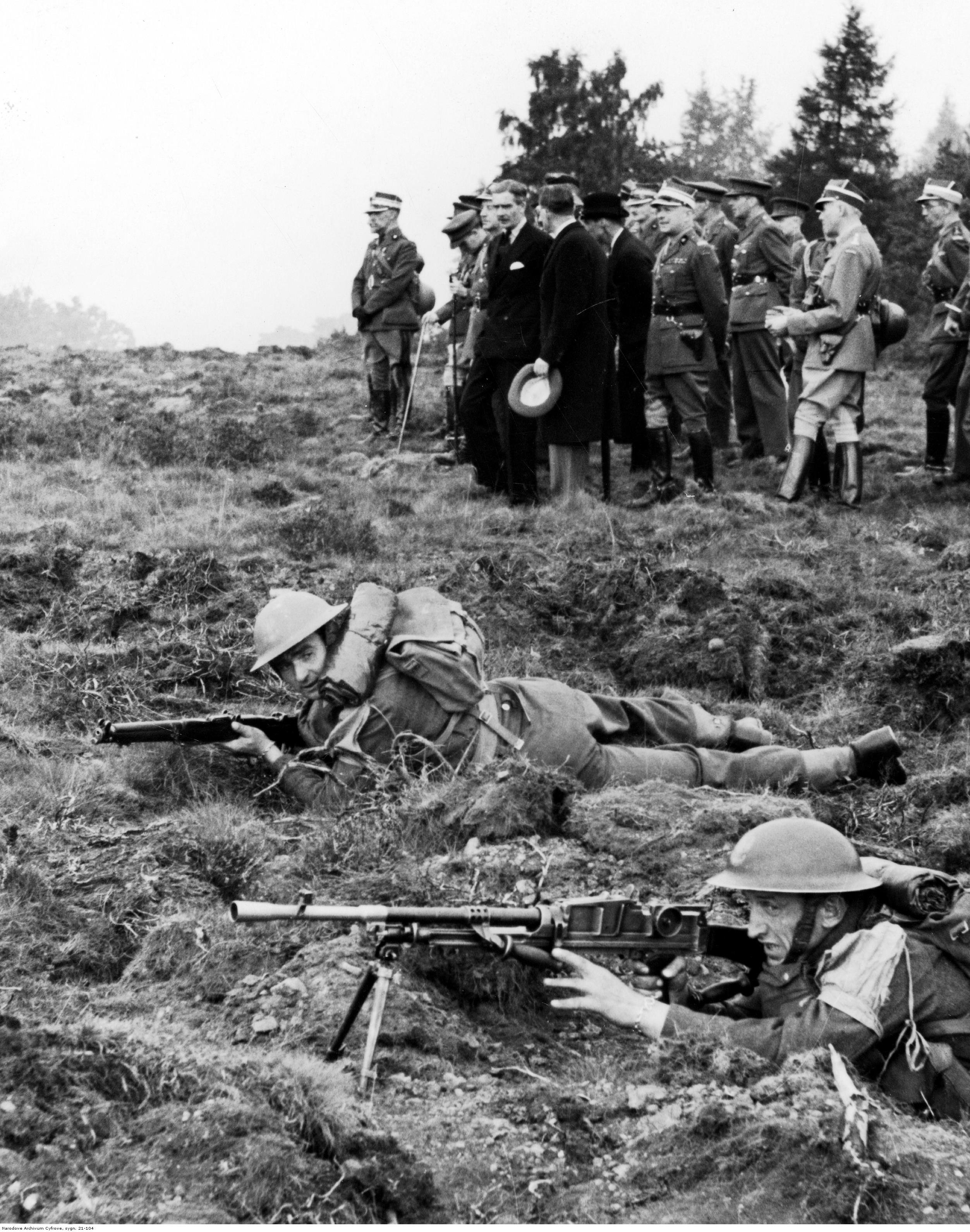 Fragment inspekcji. Widoczni w pierwszym rzędzie od prawej: ambasador RP w Wielkiej Brytanii Edward Raczyński, minister spraw zagranicznych Wielkiej Brytanii Anthony Eden, premier RP i Naczelny Wódz, gen. Władysław Sikorski. Na pierwszym planie żołnierze na pozycji strzeleckiej - widoczny m.in. ręczny karabin maszynowy Bren.