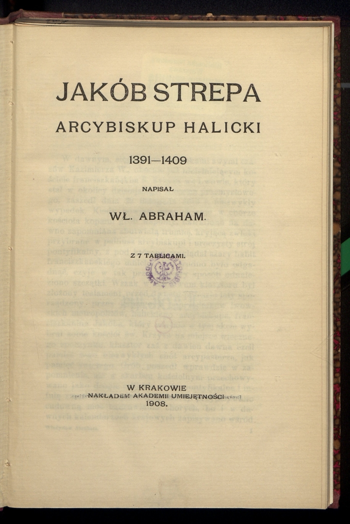 Tytułowa strona książki "Jakób Strepa arcybiskup halicki 1391-1409"., [online] Warszawa: Narodowy Instytut Audiowizualny [dostęp 28.02.2026]. Dostępny w internecie: http://www.ipsb.nina.gov.pl/a/foto/jakub-strepa-arcybiskup-halicki-1391-1409-wladyslawa-abrahama