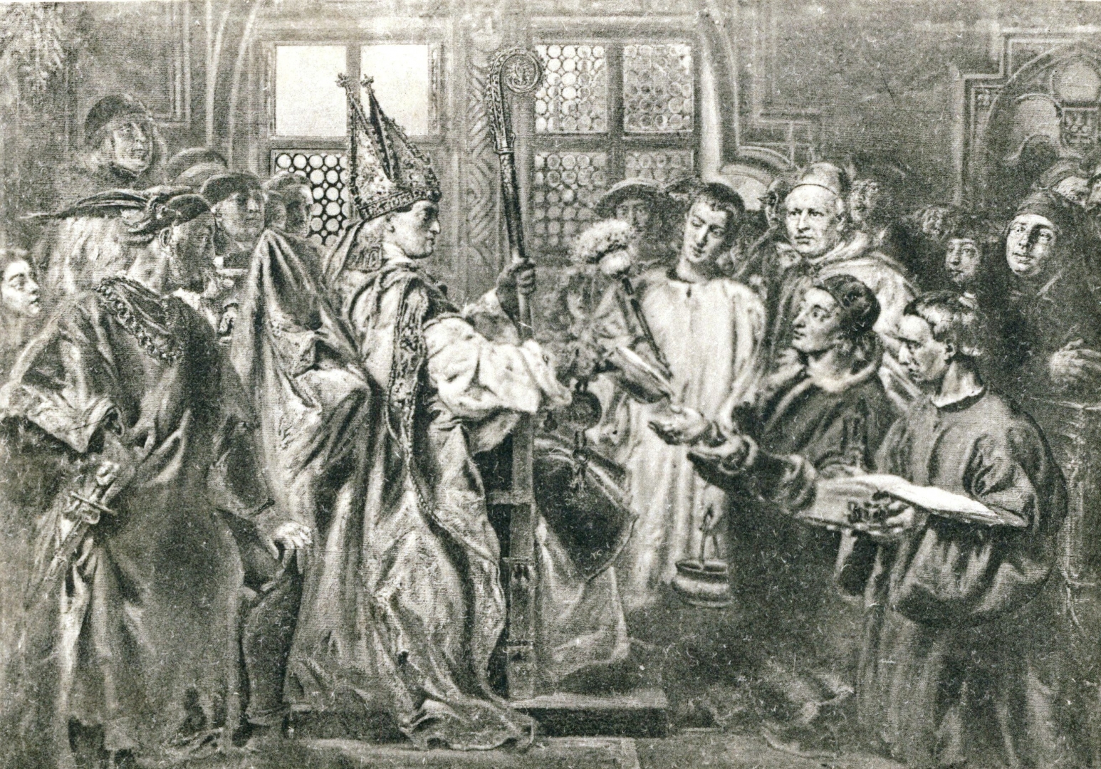 "Jan Długosz nominowany arcybiskupem lwowskim (1480)" Jana Matejki., [online] Warszawa: Narodowy Instytut Audiowizualny [dostęp 13.04.2026]. Dostępny w internecie: http://www.ipsb.nina.gov.pl/a/foto/jan-dlugosz-nominowany-arcybiskupem-lwowskim-1480-jana-matejki
