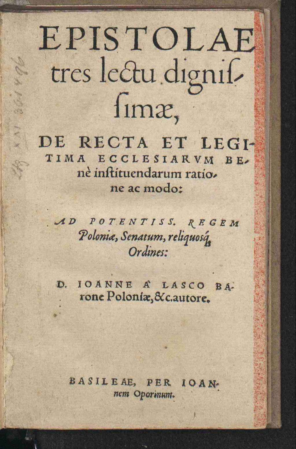 Jan Łaski  "Epistolae tres lectu dignissimae, de recta et legitima ecclesiarvm bene instituendarum ratione ac modo ad potentiss. regem Poloniae, senatum reliquosque ordines." (strona tytułowa)