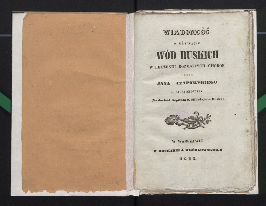 Jan Oczapowski "Wiadomość o używaniu wód buskich w leczeniu rozmaitych chorób" (strona tytułowa), [online] Warszawa: Narodowy Instytut Audiowizualny [dostęp 14.04.2026]. Dostępny w internecie: http://www.ipsb.nina.gov.pl/a/foto/jan-oczapowski-wiadomosc-o-uzywaniu-wod-buskich-w-leczeniu-rozmaitych-chorob-strona-tytulowa