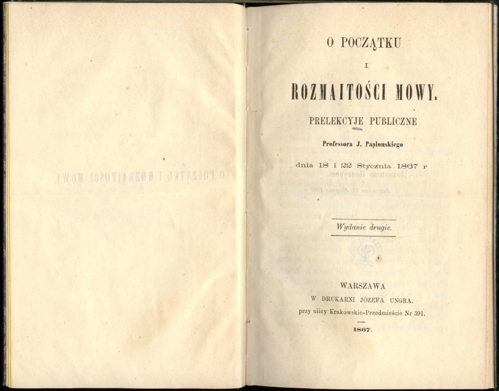Jan Papłoński "O początku i rozmaitościach mowy: prelekcyje publ. J. Papłońskiego dn. 18 i 22 stycz. 1867 r." (strona tytułowa), [online] Warszawa: Narodowy Instytut Audiowizualny [dostęp 04.04.2026]. Dostępny w internecie: http://www.ipsb.nina.gov.pl/a/foto/jan-paplonski-o-poczatku-i-rozmaitosciach-mowy-prelekcyje-publ-j-paplonskiego-dn-18-i-22-stycz-1867-r-strona-tytulowa