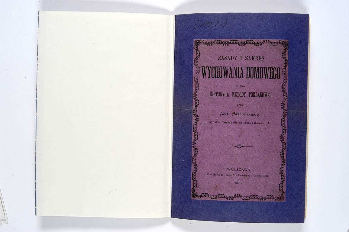 Jan Papłoński "Zasady i zakres wychowania domowego oraz historyja metody poglądowej" (strona tytułowa), [online] Warszawa: Narodowy Instytut Audiowizualny [dostęp 04.04.2026]. Dostępny w internecie: http://www.ipsb.nina.gov.pl/a/foto/jan-paplonski-zasady-i-zakres-wychowania-domowego-oraz-historyja-metody-pogladowej-strona-tytulowa