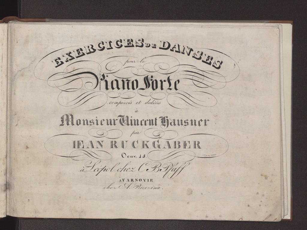 Jan Ruckgaber "Exercices de danses: pour le Piano forte: Oeuv. 15" (strona tytułowa), [online] Warszawa: Narodowy Instytut Audiowizualny [dostęp 04.04.2026]. Dostępny w internecie: http://www.ipsb.nina.gov.pl/a/foto/jan-ruckgaber-exercices-de-danses-pour-le-piano-forte-oeuv-15-strona-tytulowa