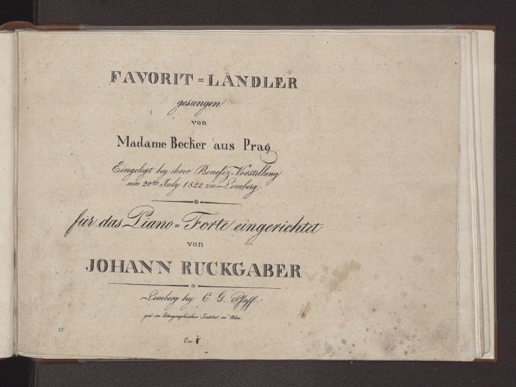 Jan Ruckgaber "Favorit-Landler: gesungen von Madame Becker aus Prag: eingelegt bey ihrer Benefiz-Vorstellung am 20ten July 1822 zu Lemberg: fur das Piano-Forte eingerichtet: ouv. 1" (strona tytułowa), [online] Warszawa: Narodowy Instytut Audiowizualny [dostęp 04.04.2026]. Dostępny w internecie: http://www.ipsb.nina.gov.pl/a/foto/jan-ruckgaber-favorit-landler-gesungen-von-madame-becker-aus-prag-eingelegt-bey-ihrer-benefiz-vorstellung-am-20ten-july-1822-zu-lemberg-fur-das-piano-forte-eingerichtet-ouv-1-strona-tytulowa