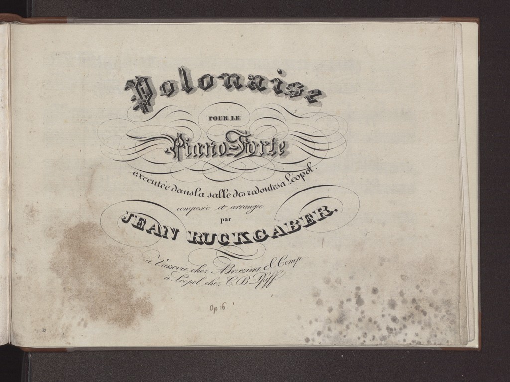 Jan Ruckgaber "Polonaise: pour le piano-forte: op. 16: executée dans la salle des redontes a Leopol" (strona tytułowa), [online] Warszawa: Narodowy Instytut Audiowizualny [dostęp 04.04.2026]. Dostępny w internecie: http://www.ipsb.nina.gov.pl/a/foto/jan-ruckgaber-polonaise-pour-le-piano-forte-op-16-execute-dans-la-salle-des-redontes-a-leopol-strona-tytulowa
