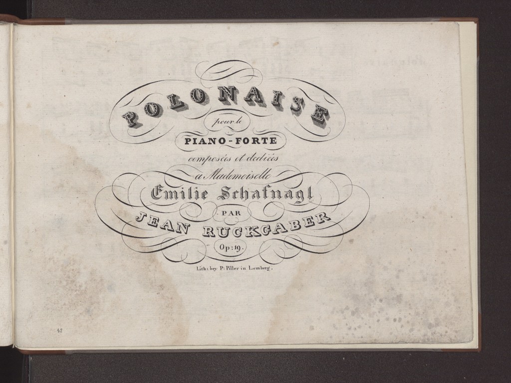 Jan Ruckgaber "Polonaise: pour le piano-forte: op. 19" (strona tytułowa), [online] Warszawa: Narodowy Instytut Audiowizualny [dostęp 04.04.2026]. Dostępny w internecie: http://www.ipsb.nina.gov.pl/a/foto/jan-ruckgaber-polonaise-pour-le-piano-forte-op-19-strona-tytulowa-1