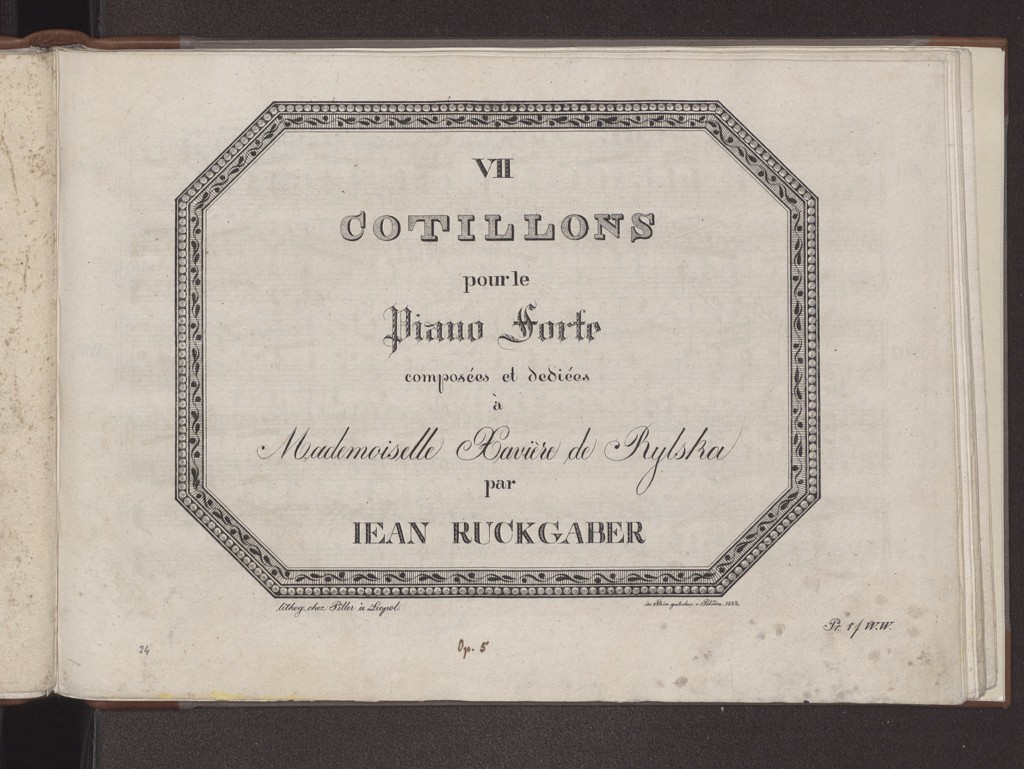 Jan Ruckgaber "VII Cotillons: pour le Piano-forte: op. 5: composees et dediees a Mademoiselle Xaviere de Rylska" (strona tytułowa), [online] Warszawa: Narodowy Instytut Audiowizualny [dostęp 04.04.2026]. Dostępny w internecie: http://www.ipsb.nina.gov.pl/a/foto/jan-ruckgaber-vii-cotillons-pour-le-piano-forte-op-5-composees-et-dediees-a-mademoiselle-xaviere-de-rylska-strona-tytulowa