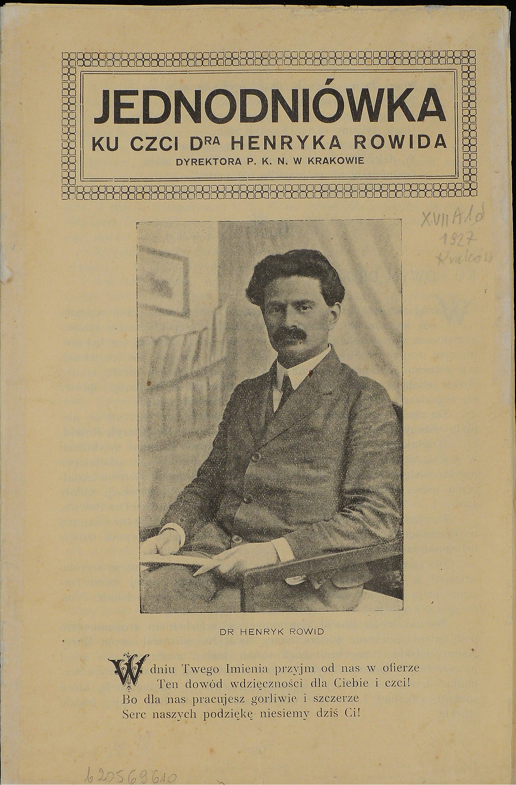 , Jednodniówka ku czci dra Henryka Rowida dyrektora P.K.N. w Krakowie (1. strona), [w:] Polski słownik biograficzny, t. ,
