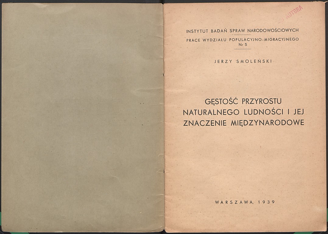 Jerzy Smoleński "Gęstość przyrostu naturalnego ludności i jej znaczenie międzynarodowe" (strona tytułowa), [online] Warszawa: Narodowy Instytut Audiowizualny [dostęp 13.04.2026]. Dostępny w internecie: http://www.ipsb.nina.gov.pl/a/foto/jerzy-smolenski-gestosc-przyrostu-naturalnego-ludnosci-i-jej-znaczenie-miedzynarodowe-strona-tytulowa