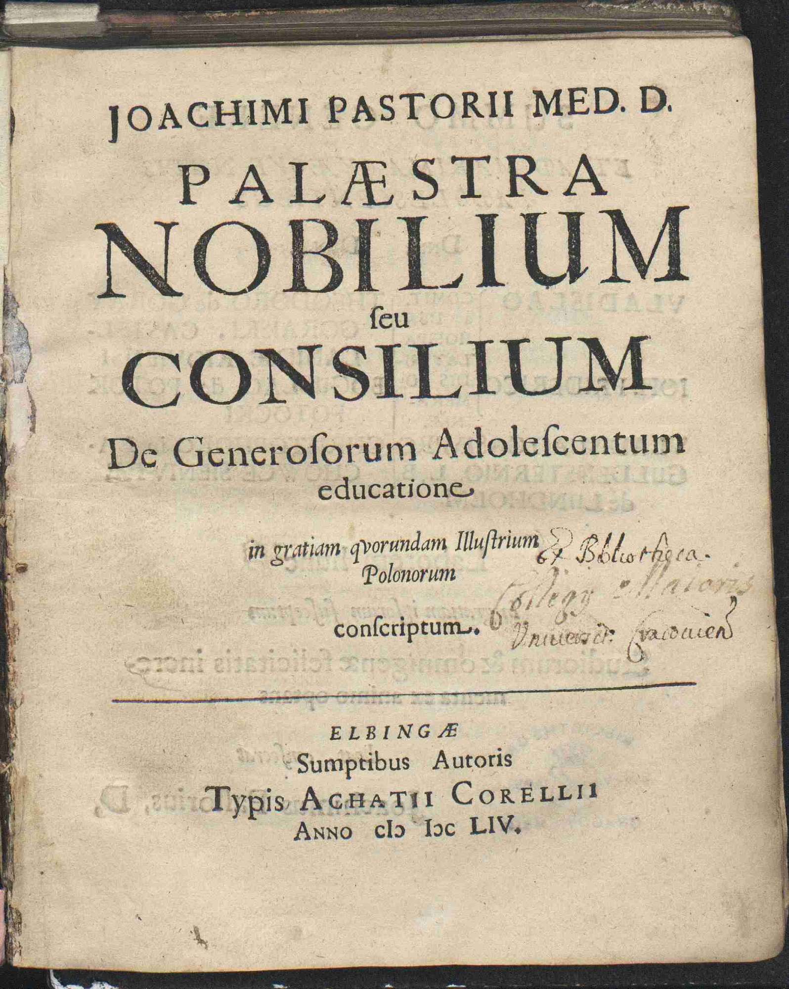 , Joachim Pastorius "Joachimi Pastorii Palaestra nobilium seu Consilium de generosorum [...}" (strona tytułowa), [w:] Polski słownik biograficzny, t. ,