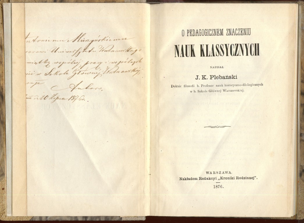 Józef Kazimierz Plebański "O pedagogicznem znaczeniu nauk klassycznych" (strona tytułowa), [online] Warszawa: Narodowy Instytut Audiowizualny [dostęp 15.04.2026]. Dostępny w internecie: http://www.ipsb.nina.gov.pl/a/foto/jozef-kazimierz-plebanski-o-pedagogicznem-znaczeniu-nauk-klassycznych-strona-tytulowa