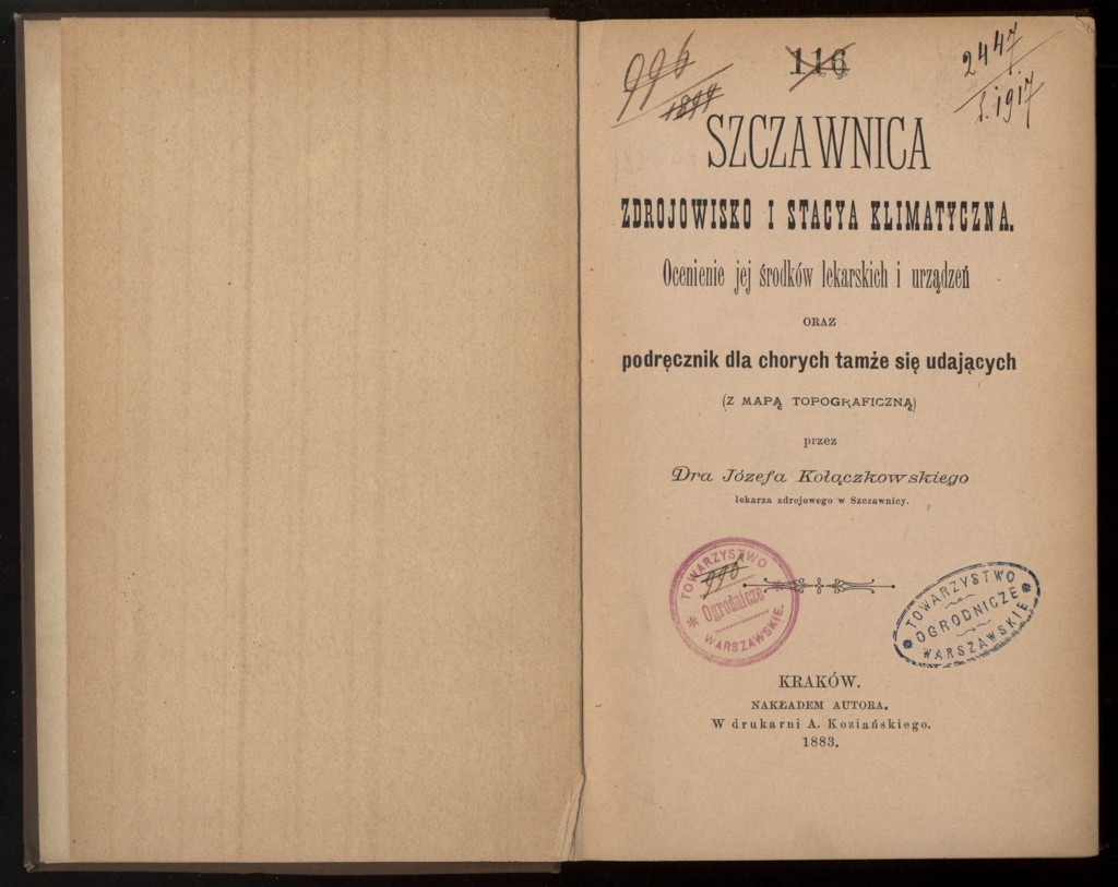 Józef Kołączkowski, "Szczawnica, zdrojowisko i stacya klimatyczna : ocenienie jej środków lekarskich i urządzeń oraz podręcznik dla chorych tamże się udających" (strona tytułowa), [online] Warszawa: Narodowy Instytut Audiowizualny [dostęp 13.04.2026]. Dostępny w internecie: http://www.ipsb.nina.gov.pl/a/foto/jozef-kolaczkowski-szczawnica-zdrojowisko-i-stacya-klimatyczna-ocenienie-jej-srodkow-lekarskich-i-urzadzen-oraz-podrecznik-dla-chorych-tamze-sie-udajacych-strona-tytulowa