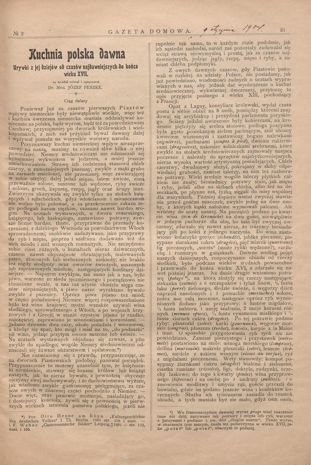 Józef Peszke "Kuchnia polska dawna: urywki z jej dziejów od czasów najdawniejszych do końca wieku XVII" w " Gazeta Domowa", [online] Warszawa: Narodowy Instytut Audiowizualny [dostęp 27.02.2026]. Dostępny w internecie: http://www.ipsb.nina.gov.pl/a/foto/jozef-peszke-kuchnia-polska-dawna-urywki-z-jej-dziejow-od-czasow-najdawniejszych-do-konca-wieku-xvii-w-gazeta-domowa