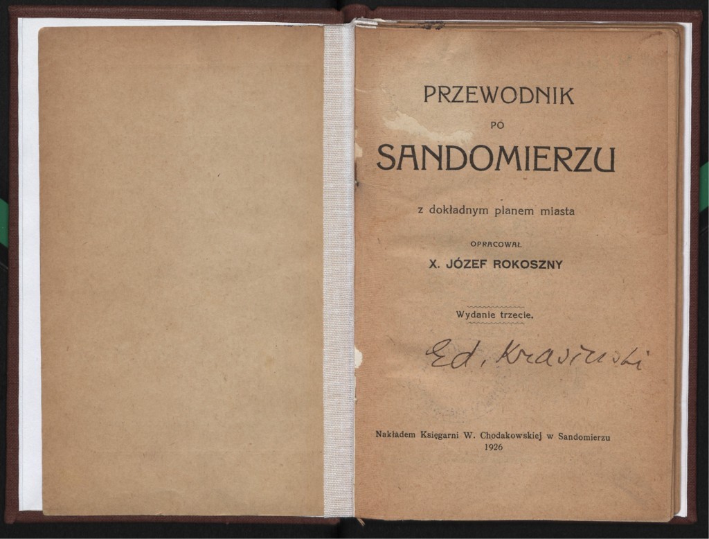 Józef Rokoszny "Przewodnik po Sandomierzu: z dokładnym planem miasta" (strona tytułowa), [online] Warszawa: Narodowy Instytut Audiowizualny [dostęp 27.02.2026]. Dostępny w internecie: http://www.ipsb.nina.gov.pl/a/foto/jozef-rokoszny-przewodnik-po-sandomierzu-z-dokladnym-planem-miasta-strona-tytulowa