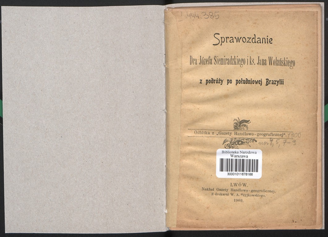 Józef Siemiradzki "Sprawozdanie Józefa Siemiradzkiego i Jana Wolańskiego z podróży do południowej Brazylii" (strona tytułowa), [online] Warszawa: Narodowy Instytut Audiowizualny [dostęp 14.04.2026]. Dostępny w internecie: http://www.ipsb.nina.gov.pl/a/foto/jozef-siemiradzki-sprawozdanie-jozefa-siemiradzkiego-i-jana-wolanskiego-z-podrozy-do-poludniowej-brazylii-strona-tytulowa