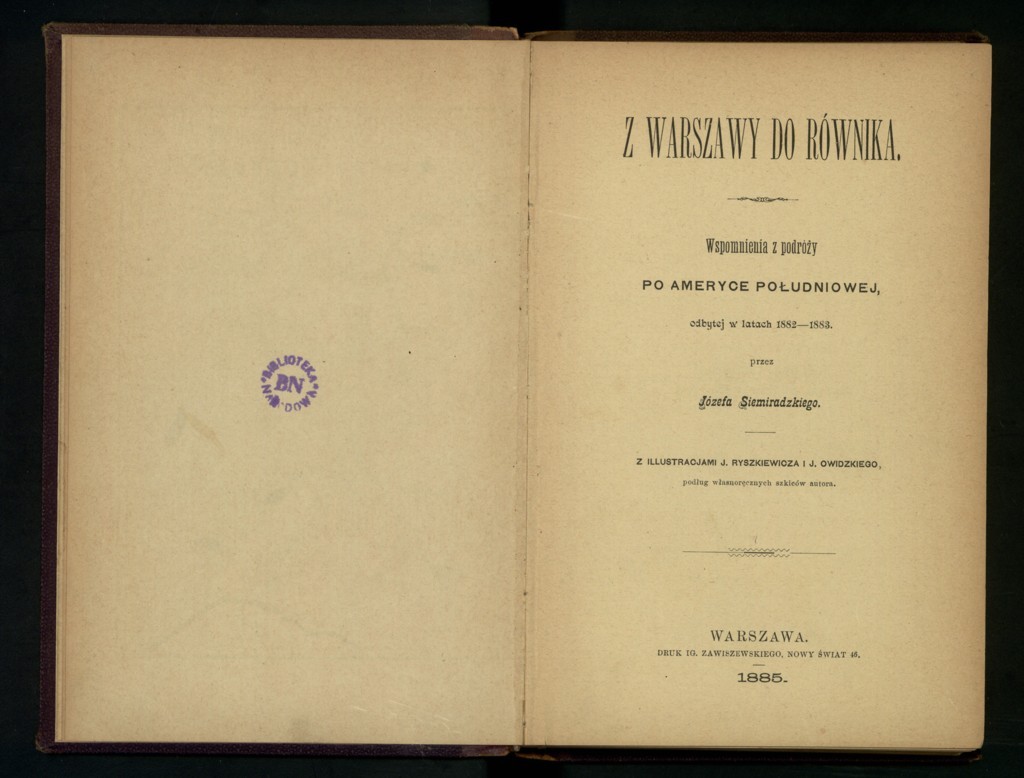 Józef Siemiradzki "Z Warszawy do równika: wspomnienia z podróży po Ameryce Południowej, odbytej w latach 1882-1883" (strona tytułowa), [online] Warszawa: Narodowy Instytut Audiowizualny [dostęp 14.04.2026]. Dostępny w internecie: http://www.ipsb.nina.gov.pl/a/foto/jozef-siemiradzki-z-warszawy-do-rownika-wspomnienia-z-podrozy-po-ameryce-poludniowej-odbytej-w-latach-1882-1883-strona-tytulowa