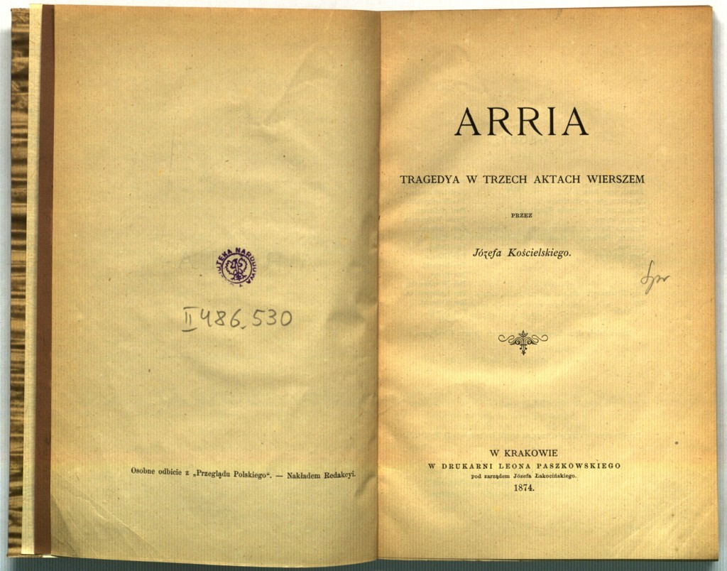 Józef Teodor Kościelski, "Arria : tragedya w 3 aktach wierszem" (strona tytułowa), [online] Warszawa: Narodowy Instytut Audiowizualny [dostęp 13.04.2026]. Dostępny w internecie: http://www.ipsb.nina.gov.pl/a/foto/jozef-teodor-koscielski-arria-tragedya-w-3-aktach-wierszem-strona-tytulowa