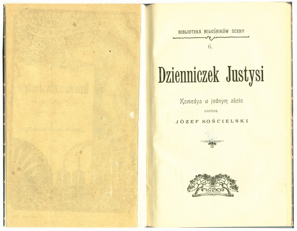 Józef Teodor Kościelski, "Dzienniczek Justysi : komedya w 1 akcie" (strona tytułowa), [online] Warszawa: Narodowy Instytut Audiowizualny [dostęp 13.04.2026]. Dostępny w internecie: http://www.ipsb.nina.gov.pl/a/foto/jozef-teodor-koscielski-dzienniczek-justysi-komedya-w-1-akcie-strona-tytulowa