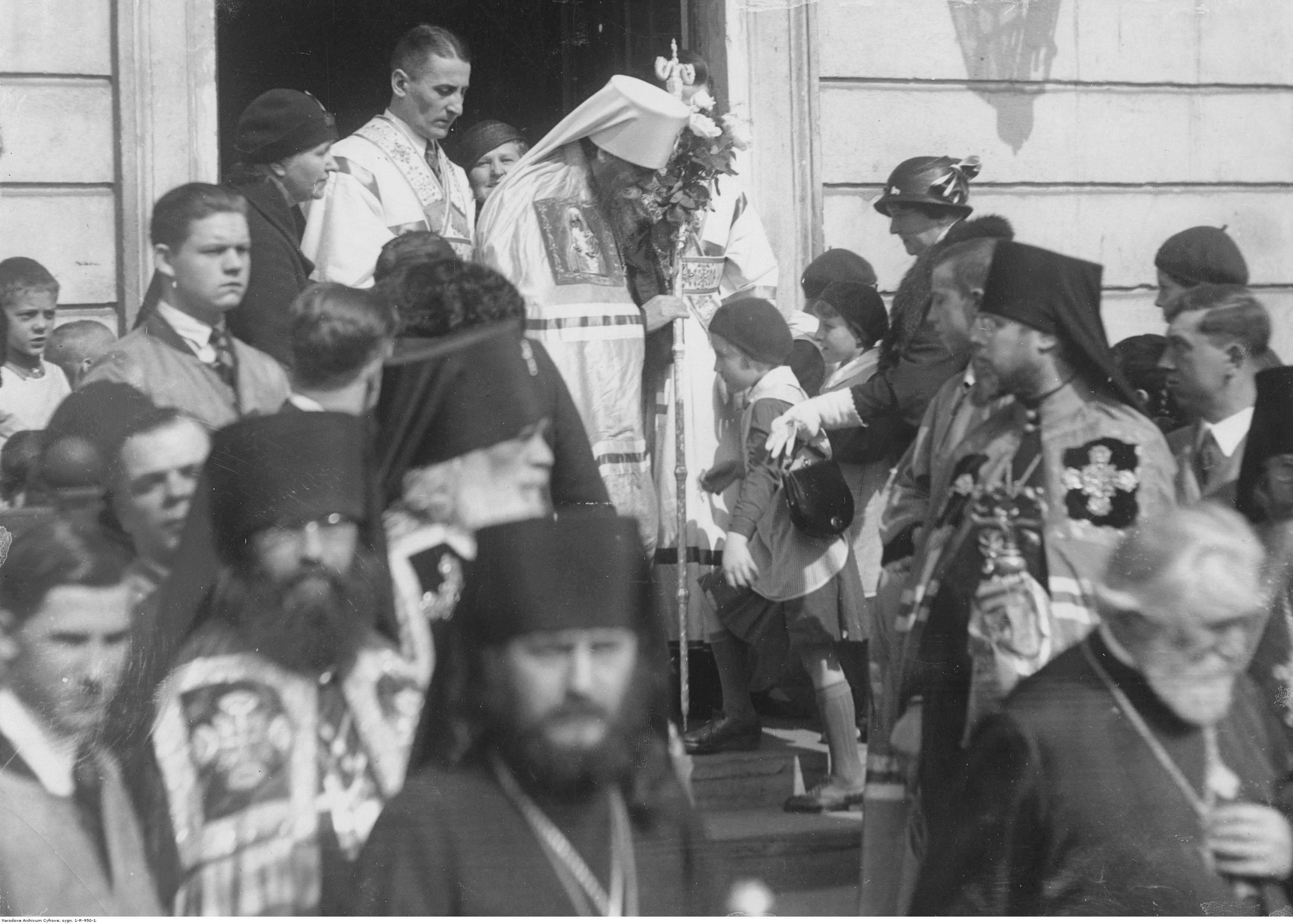 Delegacje wyprowadzają metropolitę Dionizego Waledyńskiego (z kwiatami w ręku) z domu do cerkwi. Widoczni także m.in.: prawosławny arcybiskup poleski Aleksander Inoziemcow (w okularach, z prawej, stoi bokiem), arcybiskup wileński Teodozjusz Fieodosijew (stoi bokiem, z lewej, z siwą brodą).