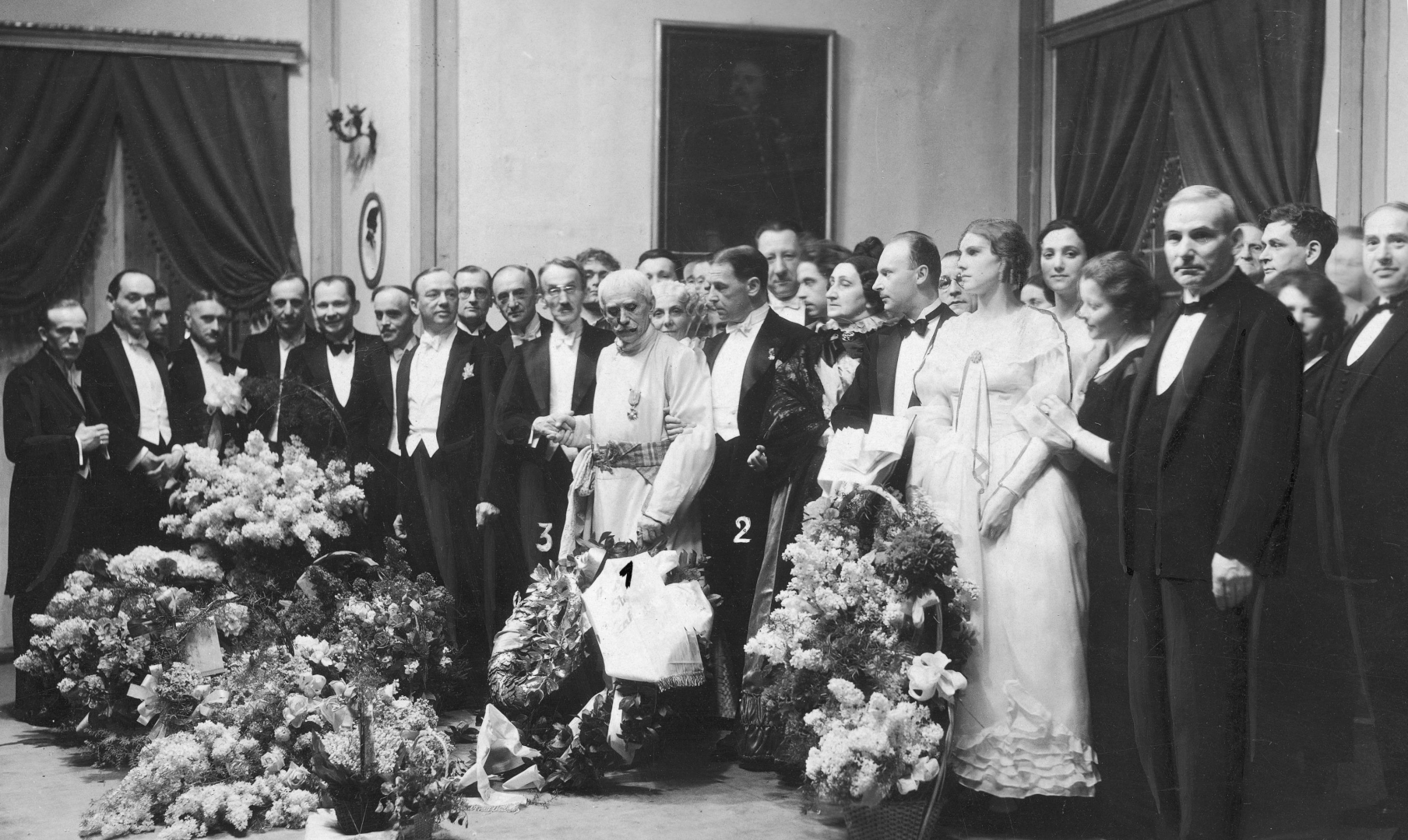 Artysta Ludwik Solski (1) na scenie w otoczeniu uczestników uroczystości jubileuszowej. Widoczni m.in. aktor Juliusz Osterwa (2), redaktor Józef Flach (3), aktor Stefan Rurski (wysunięty do przodu z prawej), aktor Ludwik Ruszkowski (stoi za Juliuszem Osterwą w muszce).